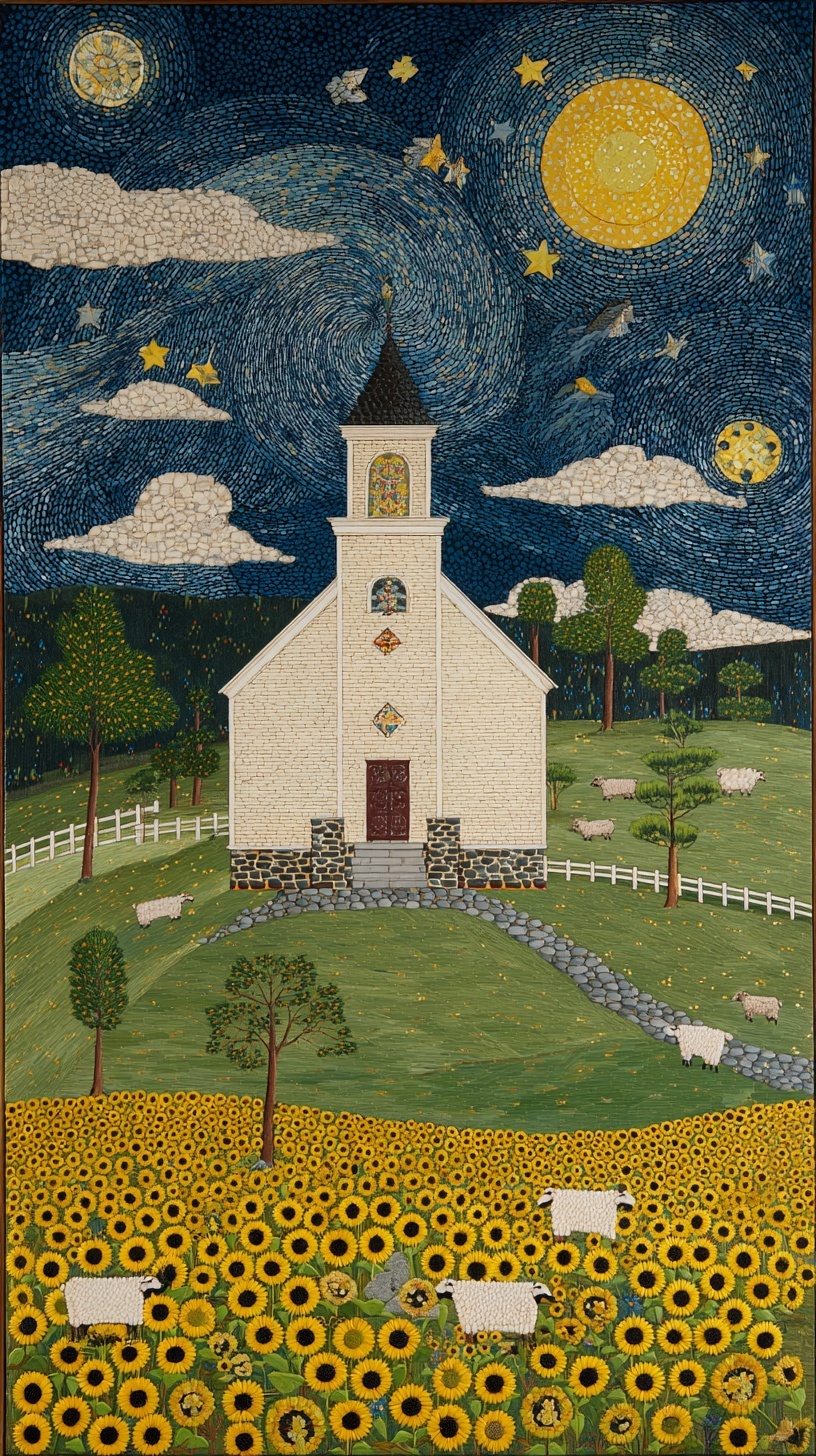 A whimsical folk art mosaic landscape depicting a quaint white church with a dark steeple and stained glass windows on a vibrant green hill. A winding stone path leads to the church entrance. Fluffy white sheep graze peacefully on the hill and in a vast field of vibrant yellow sunflowers at the bottom of the frame, each element rendered with distinct, irregular mosaic pieces. The sky is a deep, swirling indigo blue, filled with a large bright yellow textured full moon, smaller crescent moons, numerous glowing yellow stars, and fluffy white textured clouds, strongly reminiscent of Van Gogh's 'Starry Night' style. Scattered stylized trees and a white picket fence add to the idyllic scene. The entire image has a rich, intricate collage and mosaic texture, with all elements appearing to be meticulously crafted from small, irregular, colorful pieces of stone, glass, and ceramic. Nocturnal lighting with an ethereal glow from the moon and stars, soft ambient light illuminating the scene. Color palette of deep blues, vibrant yellows, earthy greens, warm whites, dark browns, with touches of red and multi-colored stained glass hues. Dreamy, serene, comforting, idyllic, and magical mood. Vertical full shot composition, establishing shot, slightly elevated perspective looking down on the sunflower field, rule of thirds applied to the church placement. Highly detailed, intricate textures, sharp focus, artistic, high resolution, award-winning illustration. --ar 9:16 --v 6.0 --style raw